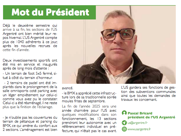 En tant que président de l’US Argentré, je voudrai tout particulièrement remercier les équipes de bénévoles qui donnent beaucoup de leur temps et de leur énergie pour que cette dynamique sportive continue d’exister demain… Cette diversité de sports est une vraie richesse pour notre commune.